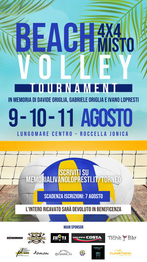 Ciao a tutti, siamo ancora qui per portarvi sulla sabbia di Roccella Jonica per la settima edizione del Memorial IVANO LOPRESTI insieme al Memorial DAVIDE e GABRIELE ORIGLIA che questa estate si svolgerà nei giorni 6-7-8-9 agosto presso il campo "Lido Cuba Libre".